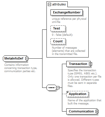 | source | <xsd:element name="Metainfo" type="MetaInfoDef"> <xsd:annotation> <xsd:documentation>In the TD04 interface only one recipient is used, i.e. only 2 or 3 participants can be specified for a transmission.</xsd:documentation> <xsd:documentation>The attribute Alias="HPA" is used for the participant code.</xsd:documentation> </xsd:annotation> </xsd:element> |