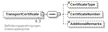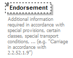 | source | <xsd:element name="Endorsement" minOccurs="0"> <xsd:annotation> <xsd:documentation>Additional information required in accordance with special provisions, certain classes, special transport conditions, ... (e.g. "Carriage in accordance with 2.2.52.1.9")</xsd:documentation> <xsd:documentation xml:lang="DE">Zusatzangaben, besondere Bestimmungen etc. (z.B. "Transport in Übereinstimmung mit 2.2.52.1.9")</xsd:documentation> </xsd:annotation> <xsd:simpleType> <xsd:restriction base="xsd:string"> <xsd:maxLength value="210"/> </xsd:restriction> </xsd:simpleType> </xsd:element> |