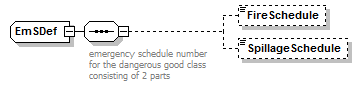 | source | <xsd:complexType name="EmSDef"> <xsd:sequence> <xsd:annotation> <xsd:documentation>emergency schedule number for the dangerous good class consisting of 2 parts</xsd:documentation> <xsd:documentation xml:lang="DE">EmS-Nummer besteht aus zwei Teilen</xsd:documentation> </xsd:annotation> <xsd:element name="FireSchedule" minOccurs="0"> <xsd:simpleType> <xsd:annotation> <xsd:documentation xml:lang="DE">Vorschriften bei Feuer</xsd:documentation> </xsd:annotation> <xsd:restriction base="xsd:string"> <xsd:maxLength value="3"/> </xsd:restriction> </xsd:simpleType> </xsd:element> <xsd:element name="SpillageSchedule" minOccurs="0"> <xsd:simpleType> <xsd:annotation> <xsd:documentation xml:lang="DE">Vorschriften bei Verschüttung</xsd:documentation> </xsd:annotation> <xsd:restriction base="xsd:string"> <xsd:maxLength value="3"/> </xsd:restriction> </xsd:simpleType> </xsd:element> </xsd:sequence> </xsd:complexType> |