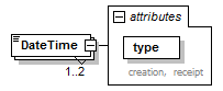 | source | <xsd:element name="DateTime" maxOccurs="2"> <xsd:complexType> <xsd:simpleContent> <xsd:extension base="xsd:dateTime"> <xsd:attribute name="type" use="required"> <xsd:annotation> <xsd:documentation>creation, receipt</xsd:documentation> <xsd:documentation xml:lang="DE">Zeitpunkt der Nachrichten-Erzeugung bzw. des Empfangs</xsd:documentation> </xsd:annotation> <xsd:simpleType> <xsd:restriction base="xsd:string"> <xsd:enumeration value="creation"/> <xsd:enumeration value="receipt"/> </xsd:restriction> </xsd:simpleType> </xsd:attribute> </xsd:extension> </xsd:simpleContent> </xsd:complexType> </xsd:element> |