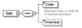 | source | <xsd:element name="Text"> <xsd:complexType> <xsd:sequence> <xsd:element name="Code"> <xsd:annotation> <xsd:documentation>Response Code, cf. code list in interface description</xsd:documentation> <xsd:documentation xml:lang="DE">Quittungscode, s. Schnittstellenbeschreibung</xsd:documentation> </xsd:annotation> <xsd:simpleType> <xsd:restriction base="xsd:string"> <xsd:maxLength value="5"/> </xsd:restriction> </xsd:simpleType> </xsd:element> <xsd:element name="FreeText" minOccurs="0"> <xsd:simpleType> <xsd:restriction base="xsd:string"> <xsd:maxLength value="200"/> </xsd:restriction> </xsd:simpleType> </xsd:element> </xsd:sequence> </xsd:complexType> </xsd:element> |
