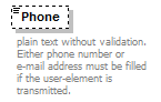 | source | <xsd:element name="Phone" minOccurs="0"> <xsd:annotation> <xsd:documentation>plain text without validation. Either phone number or e-mail address must be filled if the user-element is transmitted.</xsd:documentation> </xsd:annotation> <xsd:simpleType> <xsd:restriction base="xsd:string"> <xsd:maxLength value="35"/> </xsd:restriction> </xsd:simpleType> </xsd:element> |