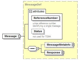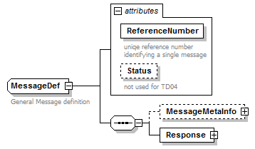 | source | <xsd:complexType name="MessageDef"> <xsd:annotation> <xsd:documentation>General Message definition</xsd:documentation> <xsd:documentation>Describes the contents of a message (metainfo and data)</xsd:documentation> </xsd:annotation> <xsd:sequence> <xsd:element name="MessageMetaInfo" type="MessageMetaInfoDef" minOccurs="0"/> <xsd:element name="Response" type="ResponseDef"/> </xsd:sequence> <xsd:attribute name="ReferenceNumber" use="required"> <xsd:annotation> <xsd:documentation xml:lang="EN">uniqe reference number identifying a single message</xsd:documentation> <xsd:documentation xml:lang="DE">Nachrichten-Referenz</xsd:documentation> </xsd:annotation> <xsd:simpleType> <xsd:restriction base="xsd:string"> <xsd:minLength value="1"/> <xsd:maxLength value="35"/> </xsd:restriction> </xsd:simpleType> </xsd:attribute> <xsd:attribute name="Status" type="xsd:string" use="optional"> <xsd:annotation> <xsd:documentation xml:lang="EN">not used for TD04</xsd:documentation> </xsd:annotation> </xsd:attribute> </xsd:complexType> |
