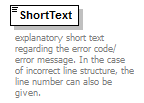 | source | <xsd:element name="ShortText"> <xsd:annotation> <xsd:documentation>explanatory short text regarding the error code/ error message. In the case of incorrect line structure, the line number can also be given.</xsd:documentation> <xsd:documentation xml:lang="DE">Kurzbeschreibung des Fehlers, u.U. auch Bezeichnung der Stelle, an der der Fehler aufgetreten ist</xsd:documentation> </xsd:annotation> <xsd:simpleType> <xsd:restriction base="xsd:string"> <xsd:maxLength value="35"/> </xsd:restriction> </xsd:simpleType> </xsd:element> |