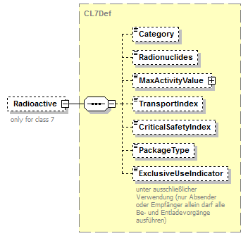 | source | <xsd:element name="Radioactive" type="CL7Def" minOccurs="0"> <xsd:annotation> <xsd:documentation>only for class 7</xsd:documentation> </xsd:annotation> </xsd:element> |