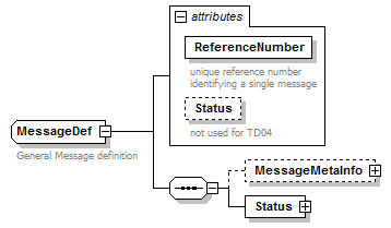 | source | <xsd:complexType name="MessageDef"> <xsd:annotation> <xsd:documentation>General Message definition</xsd:documentation> <xsd:documentation>Describes the contents of a message (metainfo and data)</xsd:documentation> </xsd:annotation> <xsd:sequence> <xsd:element name="MessageMetaInfo" type="MessageMetaInfoDef" minOccurs="0"/> <xsd:element name="Status" type="StatusDef"/> </xsd:sequence> <xsd:attribute name="ReferenceNumber" use="required"> <xsd:annotation> <xsd:documentation xml:lang="EN">unique reference number identifying a single message</xsd:documentation> <xsd:documentation xml:lang="DE">Nachrichten-Referenz</xsd:documentation> </xsd:annotation> <xsd:simpleType> <xsd:restriction base="xsd:string"> <xsd:minLength value="1"/> <xsd:maxLength value="35"/> </xsd:restriction> </xsd:simpleType> </xsd:attribute> <xsd:attribute name="Status" type="xsd:string" use="optional"> <xsd:annotation> <xsd:documentation xml:lang="EN">not used for TD04</xsd:documentation> </xsd:annotation> </xsd:attribute> </xsd:complexType> |