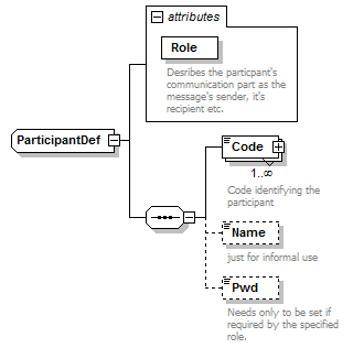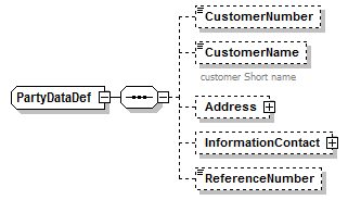 | source | <xsd:complexType name="PartyDataDef"> <xsd:sequence> <xsd:element name="CustomerNumber" minOccurs="0"> <xsd:simpleType> <xsd:annotation> <xsd:documentation>this number / code is used by the contractor to indentify the customer</xsd:documentation> <xsd:documentation xml:lang="DE">Kundennummer des Beteiligten, zur Identifizierung durch das EVU</xsd:documentation> </xsd:annotation> <xsd:restriction base="xsd:string"> <xsd:maxLength value="12"/> </xsd:restriction> </xsd:simpleType> </xsd:element> <xsd:element name="CustomerName" type="AddressFieldDef" minOccurs="0"> <xsd:annotation> <xsd:documentation>customer Short name</xsd:documentation> <xsd:documentation xml:lang="DE">Kurzname</xsd:documentation> </xsd:annotation> </xsd:element> <xsd:element name="Address" type="AddressDataDef" minOccurs="0"/> <xsd:element name="InformationContact" type="InformationContactDef" minOccurs="0"/> <xsd:element name="ReferenceNumber" minOccurs="0"> <xsd:simpleType> <xsd:annotation> <xsd:documentation xml:lang="DE">z.B. Verkehrsführer-Referenz</xsd:documentation> </xsd:annotation> <xsd:restriction base="xsd:string"> <xsd:maxLength value="35"/> </xsd:restriction> </xsd:simpleType> </xsd:element> </xsd:sequence> </xsd:complexType> |