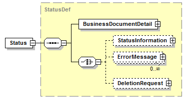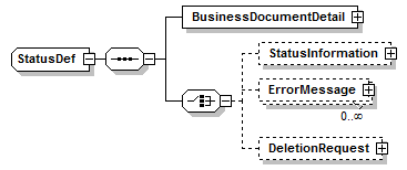 | source | <xsd:complexType name="StatusDef"> <xsd:sequence> <xsd:element name="BusinessDocumentDetail" type="BusinessDocumentDef"/> <xsd:choice> <xsd:element name="StatusInformation" type="StatusInformationDef" minOccurs="0"/> <xsd:element name="ErrorMessage" type="ErrorMessageDef" minOccurs="0" maxOccurs="unbounded"/> <xsd:element name="DeletionRequest" type="DeletionDef" minOccurs="0"/> </xsd:choice> </xsd:sequence> </xsd:complexType> |