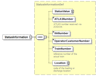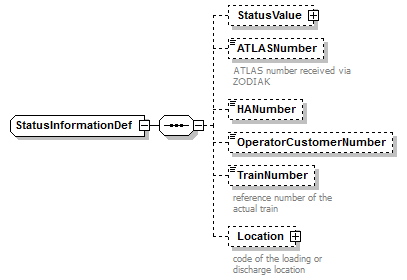 | source | <xsd:complexType name="StatusInformationDef"> <xsd:sequence> <xsd:element name="StatusValue" type="StatusValueDef" minOccurs="0"/> <xsd:element name="ATLASNumber" minOccurs="0"> <xsd:annotation> <xsd:documentation>ATLAS number received via ZODIAK</xsd:documentation> <xsd:documentation xml:lang="DE">über ZODIAK erhaltene ATLAS-Nummer</xsd:documentation> </xsd:annotation> <xsd:simpleType> <xsd:restriction base="xsd:string"> <xsd:maxLength value="21"/> </xsd:restriction> </xsd:simpleType> </xsd:element> <xsd:element name="HANumber" type="HABISNumberDef" minOccurs="0"/> <xsd:element name="OperatorCustomerNumber" minOccurs="0"> <xsd:simpleType> <xsd:restriction base="xsd:string"> <xsd:minLength value="1"/> <xsd:maxLength value="12"/> </xsd:restriction> </xsd:simpleType> </xsd:element> <xsd:element name="TrainNumber" minOccurs="0"> <xsd:annotation> <xsd:documentation>reference number of the actual train</xsd:documentation> <xsd:documentation xml:lang="DE">Zugnummer</xsd:documentation> </xsd:annotation> <xsd:simpleType> <xsd:restriction base="xsd:string"> <xsd:maxLength value="6"/> </xsd:restriction> </xsd:simpleType> </xsd:element> <xsd:element name="Location" type="LocationDef" minOccurs="0"> <xsd:annotation> <xsd:documentation>code of the loading or discharge location</xsd:documentation> <xsd:documentation xml:lang="DE">Lade- oder Entladestelle, codiert</xsd:documentation> </xsd:annotation> </xsd:element> </xsd:sequence> </xsd:complexType> |
