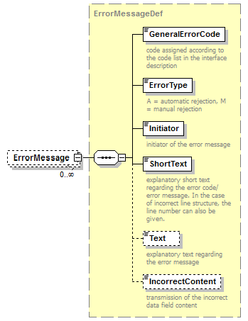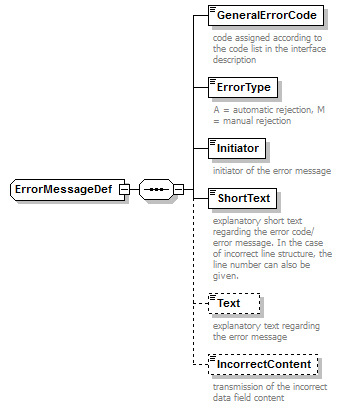 | source | <xsd:complexType name="ErrorMessageDef"> <xsd:sequence> <xsd:element name="GeneralErrorCode"> <xsd:annotation> <xsd:documentation>code assigned according to the code list in the interface description</xsd:documentation> <xsd:documentation xml:lang="DE">Fehlercode, s. Schnittstellenbeschreibung</xsd:documentation> </xsd:annotation> <xsd:simpleType> <xsd:restriction base="xsd:string"> <xsd:maxLength value="5"/> </xsd:restriction> </xsd:simpleType> </xsd:element> <xsd:element name="ErrorType"> <xsd:annotation> <xsd:documentation>A = automatic rejection, M = manual rejection</xsd:documentation> <xsd:documentation xml:lang="DE">A = automatische Rückweisung, M = manuelle Rückweisung</xsd:documentation> </xsd:annotation> <xsd:simpleType> <xsd:restriction base="xsd:string"> <xsd:length value="1"/> </xsd:restriction> </xsd:simpleType> </xsd:element> <xsd:element name="Initiator"> <xsd:annotation> <xsd:documentation>initiator of the error message</xsd:documentation> <xsd:documentation xml:lang="DE">Auslöser der Fehlernachricht</xsd:documentation> </xsd:annotation> <xsd:simpleType> <xsd:restriction base="xsd:string"> <xsd:maxLength value="20"/> </xsd:restriction> </xsd:simpleType> </xsd:element> <xsd:element name="ShortText"> <xsd:annotation> <xsd:documentation>explanatory short text regarding the error code/ error message. In the case of incorrect line structure, the line number can also be given.</xsd:documentation> <xsd:documentation xml:lang="DE">Kurzbeschreibung des Fehlers, u.U. auch Bezeichnung der Stelle, an der der Fehler aufgetreten ist</xsd:documentation> </xsd:annotation> <xsd:simpleType> <xsd:restriction base="xsd:string"> <xsd:maxLength value="35"/> </xsd:restriction> </xsd:simpleType> </xsd:element> <xsd:element name="Text" minOccurs="0"> <xsd:annotation> <xsd:documentation>explanatory text regarding the error message</xsd:documentation> <xsd:documentation xml:lang="DE">Erläuterung des Fehlers</xsd:documentation> </xsd:annotation> <xsd:simpleType> <xsd:restriction base="xsd:string"> <xsd:maxLength value="200"/> </xsd:restriction> </xsd:simpleType> </xsd:element> <xsd:element name="IncorrectContent" minOccurs="0"> <xsd:annotation> <xsd:documentation>transmission of the incorrect data field content</xsd:documentation> <xsd:documentation xml:lang="DE">fehlerhafter Feldinhalt</xsd:documentation> </xsd:annotation> <xsd:simpleType> <xsd:restriction base="xsd:string"> <xsd:maxLength value="140"/> </xsd:restriction> </xsd:simpleType> </xsd:element> </xsd:sequence> </xsd:complexType> |