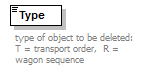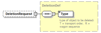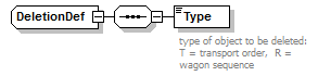 | source | <xsd:complexType name="DeletionDef"> <xsd:sequence> <xsd:element name="Type"> <xsd:annotation> <xsd:documentation>type of object to be deleted: T = transport order, R = wagon sequence</xsd:documentation> <xsd:documentation xml:lang="DE">Art des zu stornierenden Objekts: T = Transportauftrag, R = Reihung</xsd:documentation> </xsd:annotation> <xsd:simpleType> <xsd:restriction base="xsd:string"> <xsd:length value="1"/> </xsd:restriction> </xsd:simpleType> </xsd:element> </xsd:sequence> </xsd:complexType> |