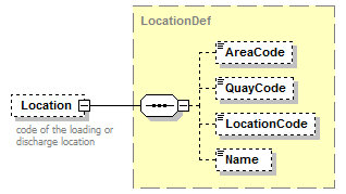 | source | <xsd:element name="Location" type="LocationDef" minOccurs="0"> <xsd:annotation> <xsd:documentation>code of the loading or discharge location</xsd:documentation> <xsd:documentation xml:lang="DE">Lade- oder Entladestelle, codiert</xsd:documentation> </xsd:annotation> </xsd:element> |