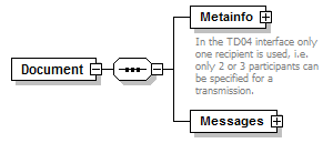 | source | <xsd:element name="Document"> <xsd:complexType> <xsd:sequence> <xsd:element name="Metainfo" type="MetaInfoDef"> <xsd:annotation> <xsd:documentation>In the TD04 interface only one recipient is used, i.e. only 2 or 3 participants can be specified for a transmission.</xsd:documentation> <xsd:documentation>The attribute Alias="HPA" is used for the participant code.</xsd:documentation> </xsd:annotation> </xsd:element> <xsd:element name="Messages"> <xsd:complexType> <xsd:sequence maxOccurs="unbounded"> <xsd:element name="Message" type="MessageDef"/> </xsd:sequence> </xsd:complexType> </xsd:element> </xsd:sequence> </xsd:complexType> </xsd:element> |