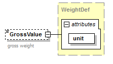 | source | <xsd:element name="GrossValue" type="WeightDef" minOccurs="0"> <xsd:annotation> <xsd:documentation>gross weight</xsd:documentation> <xsd:documentation xml:lang="DE">Bruttogewicht</xsd:documentation> </xsd:annotation> </xsd:element> |