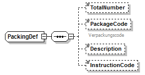 | source | <xsd:complexType name="PackingDef"> <xsd:sequence> <xsd:element name="TotalNumber" minOccurs="0"> <xsd:simpleType> <xsd:annotation> <xsd:documentation>number of package units (max. in HABIS: 999 999)</xsd:documentation> <xsd:documentation xml:lang="DE">Anzahl Packstücke (max. in HABIS: 999 999)</xsd:documentation> </xsd:annotation> <xsd:restriction base="xsd:positiveInteger"/> </xsd:simpleType> </xsd:element> <xsd:element name="PackageCode" minOccurs="0"> <xsd:annotation> <xsd:documentation xml:lang="DE">Verpackungscode</xsd:documentation> </xsd:annotation> <xsd:simpleType> <xsd:restriction base="xsd:string"> <xsd:maxLength value="6"/> </xsd:restriction> </xsd:simpleType> </xsd:element> <xsd:element name="Description" minOccurs="0"> <xsd:simpleType> <xsd:annotation> <xsd:documentation>type of packages in plain text</xsd:documentation> <xsd:documentation xml:lang="DE">Art der Verpackung als Text</xsd:documentation> </xsd:annotation> <xsd:restriction base="xsd:string"> <xsd:maxLength value="70"/> </xsd:restriction> </xsd:simpleType> </xsd:element> <xsd:element name="InstructionCode" minOccurs="0"> <xsd:simpleType> <xsd:annotation> <xsd:documentation>instruction for packaging, coded</xsd:documentation> <xsd:documentation xml:lang="DE">Verpackungsanweisung</xsd:documentation> </xsd:annotation> <xsd:restriction base="xsd:string"> <xsd:maxLength value="5"/> </xsd:restriction> </xsd:simpleType> </xsd:element> </xsd:sequence> </xsd:complexType> |