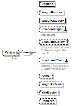 | source | <xsd:element name="Vehicle" maxOccurs="unbounded"> <xsd:complexType> <xsd:sequence> <xsd:element name="Position"> <xsd:simpleType> <xsd:annotation> <xsd:documentation>Sequence number of the wagon.</xsd:documentation> <xsd:documentation xml:lang="DE">Position des Wagens im Gleis</xsd:documentation> </xsd:annotation> <xsd:restriction base="xsd:positiveInteger"> <xsd:maxInclusive value="99"/> </xsd:restriction> </xsd:simpleType> </xsd:element> <xsd:element name="WagonNumber" type="WagonNumberDef" minOccurs="0"/> <xsd:element name="WagonCategory" type="WagonCategoryDef"/> <xsd:element name="UnladenWeight" type="WeightDef" minOccurs="0"> <xsd:annotation> <xsd:documentation xml:lang="DE">Eigengewicht</xsd:documentation> </xsd:annotation> </xsd:element> <xsd:element name="LoadLimitCSlow" type="WeightDef" minOccurs="0"> <xsd:annotation> <xsd:documentation xml:lang="DE">Lastgrenze: Streckenklasse C, Geschwindigkeit 100 bzw. 90</xsd:documentation> </xsd:annotation> </xsd:element> <xsd:element name="LoadLimitCFast" type="WeightDef" minOccurs="0"> <xsd:annotation> <xsd:documentation xml:lang="DE">Lastgrenze: Streckenklasse C, Geschwindigkeit 120</xsd:documentation> </xsd:annotation> </xsd:element> <xsd:element name="Axles" type="AxlesDef" minOccurs="0"/> <xsd:element name="WagonCriteria" minOccurs="0"> <xsd:simpleType> <xsd:annotation> <xsd:documentation xml:lang="DE">Wagenkriterien lt. HABIS Schlüsselverzeichnis A21</xsd:documentation> </xsd:annotation> <xsd:restriction base="xsd:string"> <xsd:maxLength value="2"/> </xsd:restriction> </xsd:simpleType> </xsd:element> <xsd:element name="YardSector" minOccurs="0"> <xsd:simpleType> <xsd:annotation> <xsd:documentation xml:lang="DE">Stellbereich auf dem Terminal</xsd:documentation> </xsd:annotation> <xsd:restriction base="xsd:string"> <xsd:maxLength value="8"/> </xsd:restriction> </xsd:simpleType> </xsd:element> <xsd:element name="Remarks" minOccurs="0"> <xsd:simpleType> <xsd:restriction base="xsd:string"> <xsd:maxLength value="20"/> </xsd:restriction> </xsd:simpleType> </xsd:element> </xsd:sequence> </xsd:complexType> </xsd:element> |