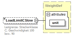 | source | <xsd:element name="LoadLimitCSlow" type="WeightDef" minOccurs="0"> <xsd:annotation> <xsd:documentation xml:lang="DE">Lastgrenze: Streckenklasse C, Geschwindigkeit 100 bzw. 90</xsd:documentation> </xsd:annotation> </xsd:element> |