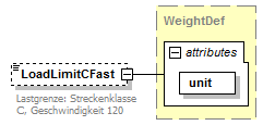 | source | <xsd:element name="LoadLimitCFast" type="WeightDef" minOccurs="0"> <xsd:annotation> <xsd:documentation xml:lang="DE">Lastgrenze: Streckenklasse C, Geschwindigkeit 120</xsd:documentation> </xsd:annotation> </xsd:element> |