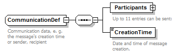 | source | <xsd:complexType name="CommunicationDef"> <xsd:annotation> <xsd:documentation>Communication data, e. g. the message's creation time or sender, recipient</xsd:documentation> </xsd:annotation> <xsd:sequence> <xsd:element name="Participants"> <xsd:annotation> <xsd:documentation>Up to 11 entries can be sent:</xsd:documentation> <xsd:documentation>SENDER - mandatory with DAKOSY-code</xsd:documentation> <xsd:documentation>RECIPIENT - mandatory with DAKOSY-Code. Maximum of nine entries is possible.</xsd:documentation> <xsd:documentation>EDI_PROVIDER</xsd:documentation> </xsd:annotation> <xsd:complexType> <xsd:sequence> <xsd:element name="Participant" type="ParticipantDef" minOccurs="2" maxOccurs="11"/> </xsd:sequence> </xsd:complexType> </xsd:element> <xsd:element name="CreationTime" type="xsd:dateTime"> <xsd:annotation> <xsd:documentation>Date and time of message creation.</xsd:documentation> <xsd:documentation>Format : 1999-05-31T13:20:00</xsd:documentation> <xsd:documentation xml:lang="EN">Use local time. Value will be read "as it is". Please do not send an offset from the UTC.</xsd:documentation> </xsd:annotation> </xsd:element> </xsd:sequence> </xsd:complexType> |