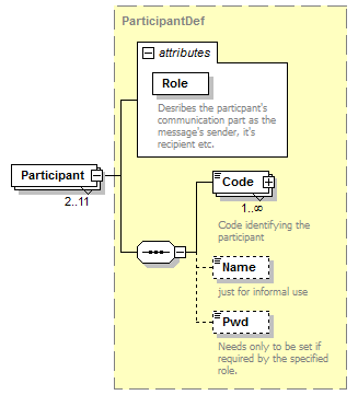| source | <xsd:element name="Participants"> <xsd:annotation> <xsd:documentation>Up to 11 entries can be sent:</xsd:documentation> <xsd:documentation>SENDER - mandatory with DAKOSY-code</xsd:documentation> <xsd:documentation>RECIPIENT - mandatory with DAKOSY-Code. Maximum of nine entries is possible.</xsd:documentation> <xsd:documentation>EDI_PROVIDER</xsd:documentation> </xsd:annotation> <xsd:complexType> <xsd:sequence> <xsd:element name="Participant" type="ParticipantDef" minOccurs="2" maxOccurs="11"/> </xsd:sequence> </xsd:complexType> </xsd:element> |
