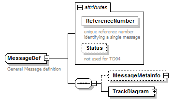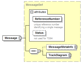 | source | <xsd:complexType name="MessageDef"> <xsd:annotation> <xsd:documentation>General Message definition</xsd:documentation> <xsd:documentation>Describes the contents of a message (metainfo and data)</xsd:documentation> </xsd:annotation> <xsd:sequence> <xsd:element name="MessageMetaInfo" type="MessageMetaInfoDef" minOccurs="0"/> <xsd:element name="TrackDiagram" type="TrackDiagramDef"/> </xsd:sequence> <xsd:attribute name="ReferenceNumber" use="required"> <xsd:annotation> <xsd:documentation xml:lang="EN">unique reference number identifying a single message</xsd:documentation> <xsd:documentation xml:lang="DE">Nachrichten-Referenz</xsd:documentation> </xsd:annotation> <xsd:simpleType> <xsd:restriction base="xsd:string"> <xsd:minLength value="1"/> <xsd:maxLength value="35"/> </xsd:restriction> </xsd:simpleType> </xsd:attribute> <xsd:attribute name="Status" type="xsd:string" use="optional"> <xsd:annotation> <xsd:documentation xml:lang="EN">not used for TD04</xsd:documentation> </xsd:annotation> </xsd:attribute> </xsd:complexType> |