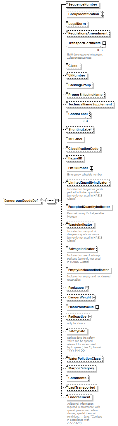 | source | <xsd:complexType name="DangerWeightDef"> <xsd:annotation> <xsd:documentation>always weight values in gram</xsd:documentation> <xsd:documentation xml:lang="DE">alle Gewichtsangaben für Gefahrgut in Gramm</xsd:documentation> </xsd:annotation> <xsd:sequence> <xsd:element name="GrossValue" type="WeightDef" minOccurs="0"> <xsd:annotation> <xsd:documentation>gross weight</xsd:documentation> <xsd:documentation xml:lang="DE">Bruttogewicht</xsd:documentation> </xsd:annotation> </xsd:element> <xsd:element name="NetValue" type="WeightDef" minOccurs="0"> <xsd:annotation> <xsd:documentation>net weight</xsd:documentation> <xsd:documentation xml:lang="DE">Nettogewicht</xsd:documentation> </xsd:annotation> </xsd:element> <xsd:element name="NetExplosiveValue" type="WeightDef" minOccurs="0"> <xsd:annotation> <xsd:documentation>net weight explosive material for class 1</xsd:documentation> <xsd:documentation xml:lang="DE">Explosivstoff-Masse (Klasse 1)</xsd:documentation> </xsd:annotation> </xsd:element> </xsd:sequence> </xsd:complexType> |