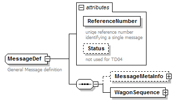 | source | <xsd:complexType name="MessageDef"> <xsd:annotation> <xsd:documentation>General Message definition</xsd:documentation> <xsd:documentation>Describes the contents of a message (metainfo and data)</xsd:documentation> </xsd:annotation> <xsd:sequence> <xsd:element name="MessageMetaInfo" type="MessageMetaInfoDef" minOccurs="0"/> <xsd:element name="WagonSequence" type="WagonSequenceDef"/> </xsd:sequence> <xsd:attribute name="ReferenceNumber" use="required"> <xsd:annotation> <xsd:documentation xml:lang="EN">uniqe reference number identifying a single message</xsd:documentation> <xsd:documentation xml:lang="DE">Nachrichten-Referenz</xsd:documentation> </xsd:annotation> <xsd:simpleType> <xsd:restriction base="xsd:string"> <xsd:minLength value="1"/> <xsd:maxLength value="35"/> </xsd:restriction> </xsd:simpleType> </xsd:attribute> <xsd:attribute name="Status" type="xsd:string" use="optional"> <xsd:annotation> <xsd:documentation xml:lang="EN">not used for TD04</xsd:documentation> </xsd:annotation> </xsd:attribute> </xsd:complexType> |