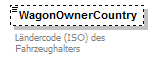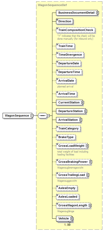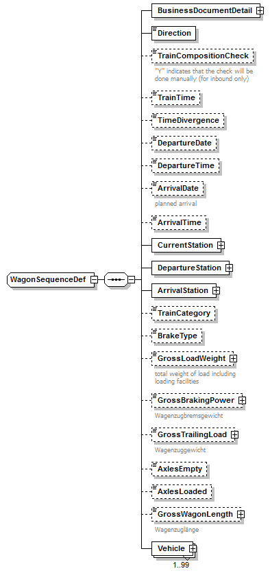 | source | <xsd:complexType name="WagonSequenceDef"> <xsd:sequence> <xsd:element name="BusinessDocumentDetail" type="BusinessDocumentDef"/> <xsd:element name="Direction"> <xsd:simpleType> <xsd:annotation> <xsd:documentation>Direction of the transport: I for Inbound (Incoming Train) and O for Outbound (outgoing train)</xsd:documentation> <xsd:documentation xml:lang="DE">Transportrichtung: I für Bahnempfang und O für Bahnversand</xsd:documentation> </xsd:annotation> <xsd:restriction base="xsd:string"> <xsd:enumeration value="I"/> <xsd:enumeration value="O"/> </xsd:restriction> </xsd:simpleType> </xsd:element> <xsd:element name="TrainCompositionCheck" type="ChoiceDef" minOccurs="0"> <xsd:annotation> <xsd:documentation>"Y" indicates that the check will be done manually (for inbound only)</xsd:documentation> <xsd:documentation xml:lang="DE">Reihungskontrolle: "Y" = soll durchgeführt werden (nur für Eingangszüge)</xsd:documentation> </xsd:annotation> </xsd:element> <xsd:element name="TrainTime" minOccurs="0"> <xsd:simpleType> <xsd:annotation> <xsd:documentation>planned departure time</xsd:documentation> <xsd:documentation xml:lang="DE">geplante Abfahrzeit</xsd:documentation> </xsd:annotation> <xsd:restriction base="xsd:time"/> </xsd:simpleType> </xsd:element> <xsd:element name="TimeDivergence" minOccurs="0"> <xsd:simpleType> <xsd:annotation> <xsd:documentation>difference in minutes to planned departure time</xsd:documentation> <xsd:documentation xml:lang="DE">Relativlage: Abweichung von geplanter Abfahrzeit in Minuten</xsd:documentation> </xsd:annotation> <xsd:restriction base="xsd:integer"> <xsd:minInclusive value="-9999"/> <xsd:maxInclusive value="+9999"/> </xsd:restriction> </xsd:simpleType> </xsd:element> <xsd:element name="DepartureDate" type="xsd:date" minOccurs="0"/> <xsd:element name="DepartureTime" type="xsd:time" minOccurs="0"/> <xsd:element name="ArrivalDate" type="xsd:date" minOccurs="0"> <xsd:annotation> <xsd:documentation>planned arrival</xsd:documentation> <xsd:documentation xml:lang="DE">geplantes Ankunftsdatum</xsd:documentation> </xsd:annotation> </xsd:element> <xsd:element name="ArrivalTime" type="xsd:time" minOccurs="0"/> <xsd:element name="CurrentStation" type="StationAreaDef"/> <xsd:element name="DepartureStation" type="StationAreaDef"/> <xsd:element name="ArrivalStation" type="StationAreaDef"/> <xsd:element name="TrainCategory" minOccurs="0"> <xsd:simpleType> <xsd:annotation> <xsd:documentation xml:lang="DE">Zuggattungsnummer</xsd:documentation> </xsd:annotation> <xsd:restriction base="xsd:string"> <xsd:length value="3"/> </xsd:restriction> </xsd:simpleType> </xsd:element> <xsd:element name="BrakeType" minOccurs="0"> <xsd:simpleType> <xsd:annotation> <xsd:documentation>C = Cargo Train, P = Passenger Train, U = Unknown</xsd:documentation> <xsd:documentation xml:lang="DE">Bremsart: C = Güterzug, P = Personenzug, U = unbekannt</xsd:documentation> </xsd:annotation> <xsd:restriction base="xsd:string"> <xsd:enumeration value="C"/> <xsd:enumeration value="P"/> <xsd:enumeration value="U"/> </xsd:restriction> </xsd:simpleType> </xsd:element> <xsd:element name="GrossLoadWeight" type="WeightDef" minOccurs="0"> <xsd:annotation> <xsd:documentation>total weight of load including loading facilities</xsd:documentation> <xsd:documentation xml:lang="DE">Gesamtgewicht der Ladung inklusive Lademittel</xsd:documentation> </xsd:annotation> </xsd:element> <xsd:element name="GrossBrakingPower" type="WeightDef" minOccurs="0"> <xsd:annotation> <xsd:documentation xml:lang="DE">Wagenzugbremsgewicht</xsd:documentation> </xsd:annotation> </xsd:element> <xsd:element name="GrossTrailingLoad" type="WeightDef" minOccurs="0"> <xsd:annotation> <xsd:documentation xml:lang="DE">Wagenzuggewicht</xsd:documentation> </xsd:annotation> </xsd:element> <xsd:element name="AxlesEmpty" minOccurs="0"> <xsd:simpleType> <xsd:annotation> <xsd:documentation>total number of axles of empty wagons</xsd:documentation> <xsd:documentation xml:lang="DE">Anzahl Achsen Leerwagen</xsd:documentation> </xsd:annotation> <xsd:restriction base="xsd:integer"/> </xsd:simpleType> </xsd:element> <xsd:element name="AxlesLoaded" minOccurs="0"> <xsd:simpleType> <xsd:annotation> <xsd:documentation>total number of axles of wagons carrying load</xsd:documentation> <xsd:documentation xml:lang="DE">Anzahl Achsen beladene Wagen</xsd:documentation> </xsd:annotation> <xsd:restriction base="xsd:integer"/> </xsd:simpleType> </xsd:element> <xsd:element name="GrossWagonLength" type="LengthDef" minOccurs="0"> <xsd:annotation> <xsd:documentation xml:lang="DE">Wagenzuglänge</xsd:documentation> </xsd:annotation> </xsd:element> <xsd:element name="Vehicle" maxOccurs="99"> <xsd:complexType> <xsd:sequence> <xsd:element name="Position"> <xsd:simpleType> <xsd:annotation> <xsd:documentation>Sequence number of the wagon.</xsd:documentation> <xsd:documentation xml:lang="DE">Position des Wagens in der Reihung.</xsd:documentation> </xsd:annotation> <xsd:restriction base="xsd:positiveInteger"> <xsd:maxInclusive value="99"/> </xsd:restriction> </xsd:simpleType> </xsd:element> <xsd:element name="VehicleType"> <xsd:simpleType> <xsd:annotation> <xsd:documentation>L=locomtive, W=wagon</xsd:documentation> </xsd:annotation> <xsd:restriction base="xsd:string"> <xsd:enumeration value="L"/> <xsd:enumeration value="W"/> </xsd:restriction> </xsd:simpleType> </xsd:element> <xsd:element name="WagonNumber" type="WagonNumberDef" minOccurs="0"> <xsd:annotation> <xsd:documentation>mandatory when VehicleType = W</xsd:documentation> <xsd:documentation xml:lang="DE">Pflicht bei VehicleType = W</xsd:documentation> </xsd:annotation> </xsd:element> <xsd:element name="EmptyFull" type="EmptyFullDef" minOccurs="0"> <xsd:annotation> <xsd:documentation>mandatory when VehicleType = W</xsd:documentation> <xsd:documentation xml:lang="DE">Pflicht bei VehicleType = W</xsd:documentation> </xsd:annotation> </xsd:element> <xsd:element name="TypeOfTransport" type="TypeOfTransportDef" minOccurs="0"/> <x