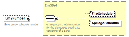 | source | <xsd:complexType name="EmSDef"> <xsd:sequence> <xsd:annotation> <xsd:documentation>emergency schedule number for the dangerous good class consisting of 2 parts</xsd:documentation> <xsd:documentation xml:lang="DE">EmS-Nummer besteht aus zwei Teilen</xsd:documentation> </xsd:annotation> <xsd:element name="FireSchedule" minOccurs="0"> <xsd:simpleType> <xsd:annotation> <xsd:documentation xml:lang="DE">Vorschriften bei Feuer</xsd:documentation> </xsd:annotation> <xsd:restriction base="xsd:string"> <xsd:maxLength value="3"/> </xsd:restriction> </xsd:simpleType> </xsd:element> <xsd:element name="SpillageSchedule" minOccurs="0"> <xsd:simpleType> <xsd:annotation> <xsd:documentation xml:lang="DE">Vorschriften bei Verschüttung</xsd:documentation> </xsd:annotation> <xsd:restriction base="xsd:string"> <xsd:maxLength value="3"/> </xsd:restriction> </xsd:simpleType> </xsd:element> </xsd:sequence> </xsd:complexType> |