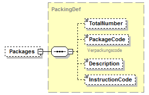 | source | <xsd:complexType name="PackingDef"> <xsd:sequence> <xsd:element name="TotalNumber" minOccurs="0"> <xsd:simpleType> <xsd:annotation> <xsd:documentation>number of package units (max. in HABIS: 999 999)</xsd:documentation> <xsd:documentation xml:lang="DE">Anzahl Packstücke (max. in HABIS: 999 999)</xsd:documentation> </xsd:annotation> <xsd:restriction base="xsd:positiveInteger"/> </xsd:simpleType> </xsd:element> <xsd:element name="PackageCode" minOccurs="0"> <xsd:annotation> <xsd:documentation xml:lang="DE">Verpackungscode</xsd:documentation> </xsd:annotation> <xsd:simpleType> <xsd:restriction base="xsd:string"> <xsd:maxLength value="6"/> </xsd:restriction> </xsd:simpleType> </xsd:element> <xsd:element name="Description" minOccurs="0"> <xsd:simpleType> <xsd:annotation> <xsd:documentation>type of packages in plain text</xsd:documentation> <xsd:documentation xml:lang="DE">Art der Verpackung als Text</xsd:documentation> </xsd:annotation> <xsd:restriction base="xsd:string"> <xsd:maxLength value="70"/> </xsd:restriction> </xsd:simpleType> </xsd:element> <xsd:element name="InstructionCode" minOccurs="0"> <xsd:simpleType> <xsd:annotation> <xsd:documentation>instruction for packaging, coded</xsd:documentation> <xsd:documentation xml:lang="DE">Verpackungsanweisung</xsd:documentation> </xsd:annotation> <xsd:restriction base="xsd:string"> <xsd:maxLength value="5"/> </xsd:restriction> </xsd:simpleType> </xsd:element> </xsd:sequence> </xsd:complexType> |