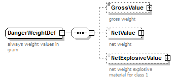 | source | <xsd:complexType name="DangerWeightDef"> <xsd:annotation> <xsd:documentation>always weight values in gram</xsd:documentation> <xsd:documentation xml:lang="DE">alle Gewichtsangaben für Gefahrgut in Gramm</xsd:documentation> </xsd:annotation> <xsd:sequence> <xsd:element name="GrossValue" type="WeightDef" minOccurs="0"> <xsd:annotation> <xsd:documentation>gross weight</xsd:documentation> <xsd:documentation xml:lang="DE">Bruttogewicht</xsd:documentation> </xsd:annotation> </xsd:element> <xsd:element name="NetValue" type="WeightDef" minOccurs="0"> <xsd:annotation> <xsd:documentation>net weight</xsd:documentation> <xsd:documentation xml:lang="DE">Nettogewicht</xsd:documentation> </xsd:annotation> </xsd:element> <xsd:element name="NetExplosiveValue" type="WeightDef" minOccurs="0"> <xsd:annotation> <xsd:documentation>net weight explosive material for class 1</xsd:documentation> <xsd:documentation xml:lang="DE">Explosivstoff-Masse (Klasse 1)</xsd:documentation> </xsd:annotation> </xsd:element> </xsd:sequence> </xsd:complexType> |