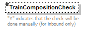 | source | <xsd:element name="TrainCompositionCheck" type="ChoiceDef" minOccurs="0"> <xsd:annotation> <xsd:documentation>"Y" indicates that the check will be done manually (for inbound only)</xsd:documentation> <xsd:documentation xml:lang="DE">Reihungskontrolle: "Y" = soll durchgeführt werden (nur für Eingangszüge)</xsd:documentation> </xsd:annotation> </xsd:element> |