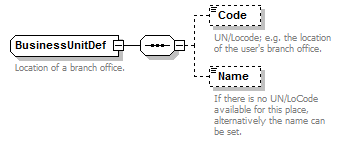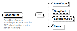 | source | <xsd:complexType name="LocationDef"> <xsd:annotation> <xsd:documentation>Area/Quay/Location according to HABIS code list A07 when location is in the port of Hamburg</xsd:documentation> <xsd:documentation xml:lang="DE">Ortsangabe, bei Ladestellen des Hamburger Hafens bestehend aus Bahnhofsbereich/Kaibetrieb/Ladestelle lt. HABIS-Schlüsselverzeichnis A07</xsd:documentation> </xsd:annotation> <xsd:sequence> <xsd:element name="AreaCode" minOccurs="0"> <xsd:simpleType> <xsd:restriction base="xsd:string"> <xsd:minLength value="1"/> <xsd:maxLength value="4"/> </xsd:restriction> </xsd:simpleType> </xsd:element> <xsd:element name="QuayCode" minOccurs="0"> <xsd:simpleType> <xsd:restriction base="xsd:string"> <xsd:minLength value="1"/> <xsd:maxLength value="4"/> </xsd:restriction> </xsd:simpleType> </xsd:element> <xsd:element name="LocationCode" minOccurs="0"> <xsd:simpleType> <xsd:restriction base="xsd:string"> <xsd:minLength value="1"/> <xsd:maxLength value="4"/> </xsd:restriction> </xsd:simpleType> </xsd:element> <xsd:element name="Name" minOccurs="0"> <xsd:simpleType> <xsd:restriction base="xsd:string"> <xsd:maxLength value="40"/> </xsd:restriction> </xsd:simpleType> </xsd:element> </xsd:sequence> </xsd:complexType> |