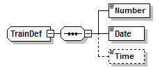 | source | <xsd:complexType name="TrainDef"> <xsd:sequence> <xsd:element name="Number"> <xsd:simpleType> <xsd:restriction base="xsd:string"> <xsd:maxLength value="6"/> <xsd:minLength value="1"/> </xsd:restriction> </xsd:simpleType> </xsd:element> <xsd:element name="Date" type="xsd:date"/> <xsd:element name="Time" type="xsd:time" minOccurs="0"/> </xsd:sequence> </xsd:complexType> |