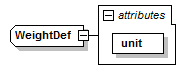 | source | <xsd:complexType name="WeightDef"> <xsd:simpleContent> <xsd:extension base="xsd:nonNegativeInteger"> <xsd:attribute name="unit" type="WeightUnit" use="required"/> </xsd:extension> </xsd:simpleContent> </xsd:complexType> |