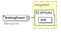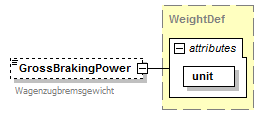 | source | <xsd:element name="GrossBrakingPower" type="WeightDef" minOccurs="0"> <xsd:annotation> <xsd:documentation xml:lang="DE">Wagenzugbremsgewicht</xsd:documentation> </xsd:annotation> </xsd:element> |
