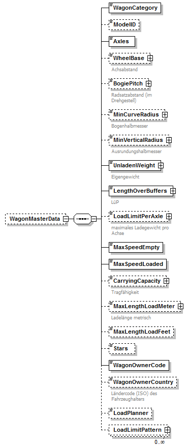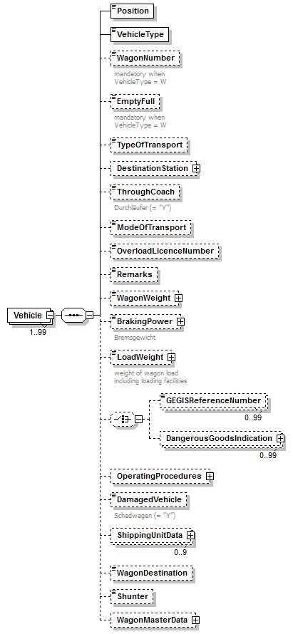 | source | <xsd:element name="Vehicle" maxOccurs="99"> <xsd:complexType> <xsd:sequence> <xsd:element name="Position"> <xsd:simpleType> <xsd:annotation> <xsd:documentation>Sequence number of the wagon.</xsd:documentation> <xsd:documentation xml:lang="DE">Position des Wagens in der Reihung.</xsd:documentation> </xsd:annotation> <xsd:restriction base="xsd:positiveInteger"> <xsd:maxInclusive value="99"/> </xsd:restriction> </xsd:simpleType> </xsd:element> <xsd:element name="VehicleType"> <xsd:simpleType> <xsd:annotation> <xsd:documentation>L=locomtive, W=wagon</xsd:documentation> </xsd:annotation> <xsd:restriction base="xsd:string"> <xsd:enumeration value="L"/> <xsd:enumeration value="W"/> </xsd:restriction> </xsd:simpleType> </xsd:element> <xsd:element name="WagonNumber" type="WagonNumberDef" minOccurs="0"> <xsd:annotation> <xsd:documentation>mandatory when VehicleType = W</xsd:documentation> <xsd:documentation xml:lang="DE">Pflicht bei VehicleType = W</xsd:documentation> </xsd:annotation> </xsd:element> <xsd:element name="EmptyFull" type="EmptyFullDef" minOccurs="0"> <xsd:annotation> <xsd:documentation>mandatory when VehicleType = W</xsd:documentation> <xsd:documentation xml:lang="DE">Pflicht bei VehicleType = W</xsd:documentation> </xsd:annotation> </xsd:element> <xsd:element name="TypeOfTransport" type="TypeOfTransportDef" minOccurs="0"/> <xsd:element name="DestinationStation" type="StationAreaDef" minOccurs="0"/> <xsd:element name="ThroughCoach" type="ChoiceDef" minOccurs="0"> <xsd:annotation> <xsd:documentation xml:lang="DE">Durchläufer (= "Y")</xsd:documentation> </xsd:annotation> </xsd:element> <xsd:element name="ModeOfTransport" minOccurs="0"> <xsd:simpleType> <xsd:annotation> <xsd:documentation xml:lang="DE">Beförderungsart</xsd:documentation> <xsd:documentation xml:lang="DE">1 = FRACHTGUT</xsd:documentation> <xsd:documentation xml:lang="DE">2 = PAPERSOLUTION "QUALITY"</xsd:documentation> <xsd:documentation xml:lang="DE">3 = KOMBINIERTER VERKEHR</xsd:documentation> <xsd:documentation xml:lang="DE">4 = INTERCARGO</xsd:documentation> <xsd:documentation xml:lang="DE">5 = GANZZUGVERKEHR</xsd:documentation> </xsd:annotation> <xsd:restriction base="xsd:string"> <xsd:length value="1"/> </xsd:restriction> </xsd:simpleType> </xsd:element> <xsd:element name="OverloadLicenceNumber" minOccurs="0"> <xsd:simpleType> <xsd:annotation> <xsd:documentation>licence number for the transport of heavy-weight load or goods exceeding the loading gauge</xsd:documentation> <xsd:documentation xml:lang="DE">Genehmigungsnummer für Schwerwagen bzw. Lademaß-Überschreitung</xsd:documentation> </xsd:annotation> <xsd:restriction base="xsd:string"> <xsd:maxLength value="6"/> </xsd:restriction> </xsd:simpleType> </xsd:element> <xsd:element name="Remarks" minOccurs="0"> <xsd:simpleType> <xsd:restriction base="xsd:string"> <xsd:maxLength value="140"/> </xsd:restriction> </xsd:simpleType> </xsd:element> <xsd:element name="WagonWeight" type="WeightDef" minOccurs="0"/> <xsd:element name="BrakingPower" type="WeightDef" minOccurs="0"> <xsd:annotation> <xsd:documentation xml:lang="DE">Bremsgewicht</xsd:documentation> </xsd:annotation> </xsd:element> <xsd:element name="LoadWeight" type="WeightDef" minOccurs="0"> <xsd:annotation> <xsd:documentation>weight of wagon load including loading facilities</xsd:documentation> <xsd:documentation xml:lang="DE">Gewicht der Ladung inklusive Lademittel</xsd:documentation> </xsd:annotation> </xsd:element> <xsd:choice minOccurs="0"> <xsd:element name="GEGISReferenceNumber" minOccurs="0" maxOccurs="99"> <xsd:simpleType> <xsd:restriction base="xsd:string"> <xsd:minLength value="1"/> <xsd:maxLength value="18"/> </xsd:restriction> </xsd:simpleType> </xsd:element> <xsd:element name="DangerousGoodsIndication" type="DanGoodsType" minOccurs="0" maxOccurs="99"/> </xsd:choice> <xsd:element name="OperatingProcedures" minOccurs="0"> <xsd:complexType> <xsd:annotation> <xsd:documentation>codes indicating special handling instructions</xsd:documentation> <xsd:documentation xml:lang="DE">betriebliche Maßnahmen</xsd:documentation> </xsd:annotation> <xsd:sequence> <xsd:element name="ProcedureCode" maxOccurs="unbounded"> <xsd:simpleType> <xsd:restriction base="xsd:string"> <xsd:maxLength value="2"/> </xsd:restriction> </xsd:simpleType> </xsd:element> </xsd:sequence> </xsd:complexType> </xsd:element> <xsd:element name="DamagedVehicle" type="ChoiceDef" minOccurs="0"> <xsd:annotation> <xsd:documentation xml:lang="DE">Schadwagen (= "Y")</xsd:documentation> </xsd:annotation> </xsd:element> <xsd:element name="ShippingUnitData" minOccurs="0" maxOccurs="9"> <xsd:complexType> <xsd:annotation> <xsd:documentation>at least one unit has to be specified if the wagon is loaded (EmptyFull=F)</xsd:documentation> <xsd:documentation xml:lang="DE">mindestens eine LE muss angegeben sein bei beladenem Waggon</xsd:documentation> </xsd:annotation> <xsd:sequence> <xsd:element name="OrderReference" type="ReferenceDef" minOccurs="3" maxOccurs="4"> <xsd:annotation> <xsd:documentation>the position of an order may be specified using type = TONR and/or CTOREF, the owner with ORDCO and the position with UNITNR</xsd:documentation> <xsd:documentation xml:lang="DE">eine Auftragsposition kann angegeben werden mittels TONR und/oder CTOREF, dem Auftragseigner mit ORDCO und der Position mit UNITNR</xsd:documentation> </xsd:annotation> </xsd:element> </xsd:sequence> </xsd:complexType> </xsd:element> <xsd:element name="WagonDestination" minOccurs="0"> <xsd:simpleType> <xsd:annotation> <xsd:documentation>destination of the wagon, e.g. terminal or outgoing train</xsd:documentation> <xsd:documentation xml:lang="DE">Zielangabe für den Wagen, z.B. Ladestelle oder Ausgangszug</xsd:documentation> </xsd:annotation> <xsd:restriction base="xsd:string"> <xsd:minLength value="1"/> <xsd:maxLength value="35"/> </xsd:restriction> </xsd:simpleType> </xsd:element> <xsd:element name="Shunter" minOccurs="0"> <xsd:simpleType> <xsd:annotation> <xsd:documentation>org